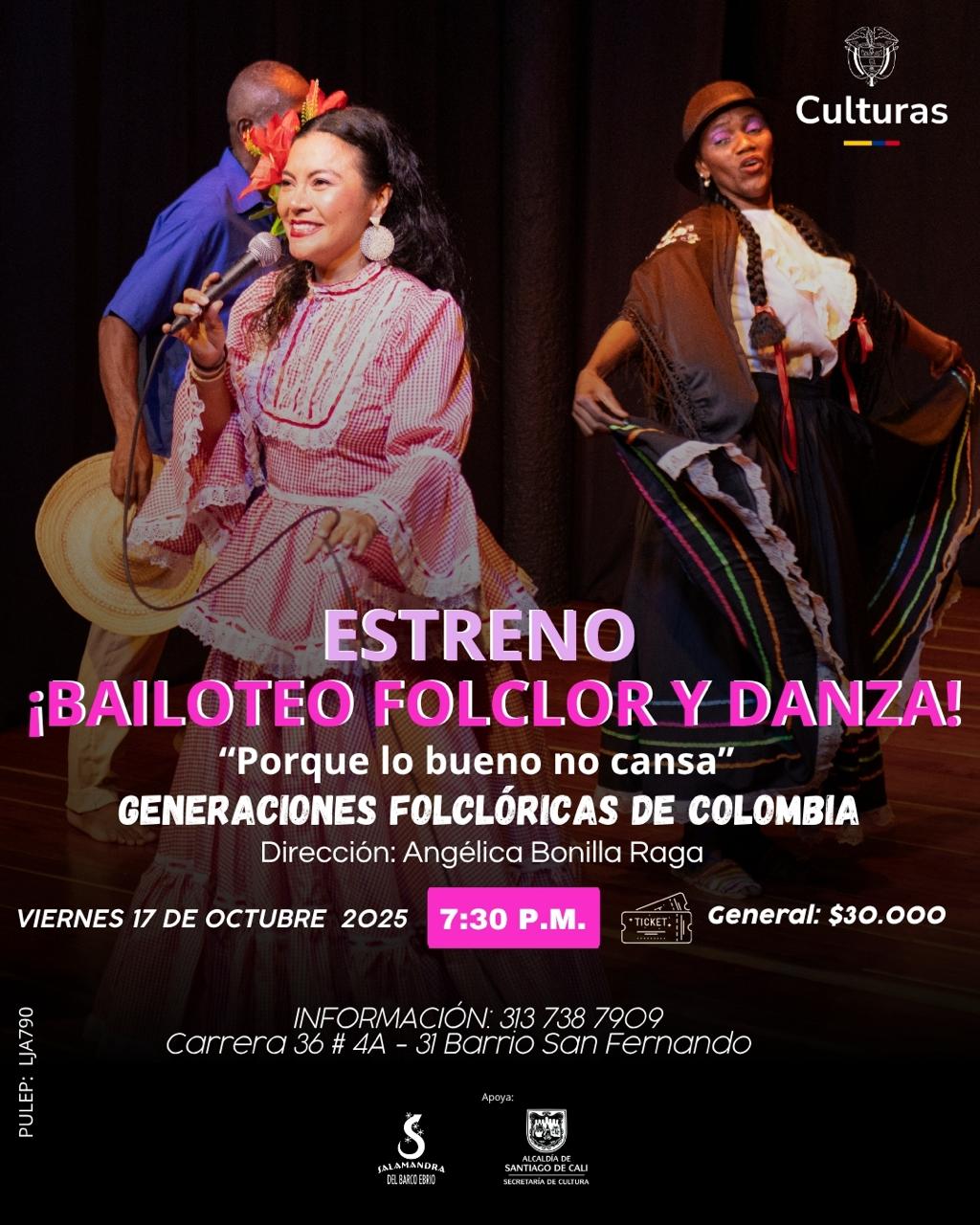El grupo Generaciones Folclóricas de Colombia, dirigido por Angélica Bonilla Raga, nació en Cali en 2009 como parte de la Fundación Cultivarte Colombia. Reúne personas de diversas edades para aprender, bailar y compartir, preservando el legado de la maestra Yolanda Azuero Ariza y exaltando la riqueza del folclor colombiano.
